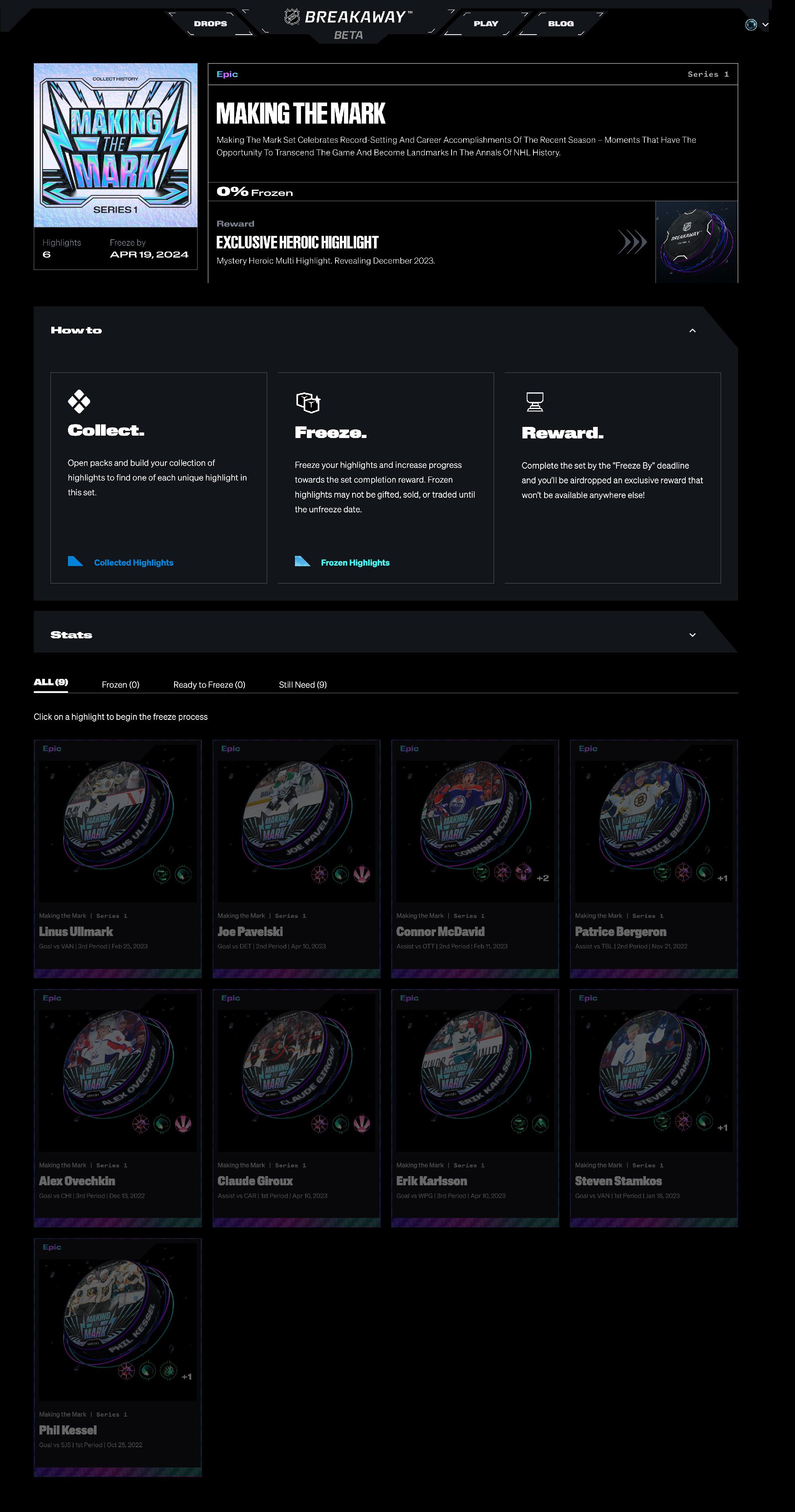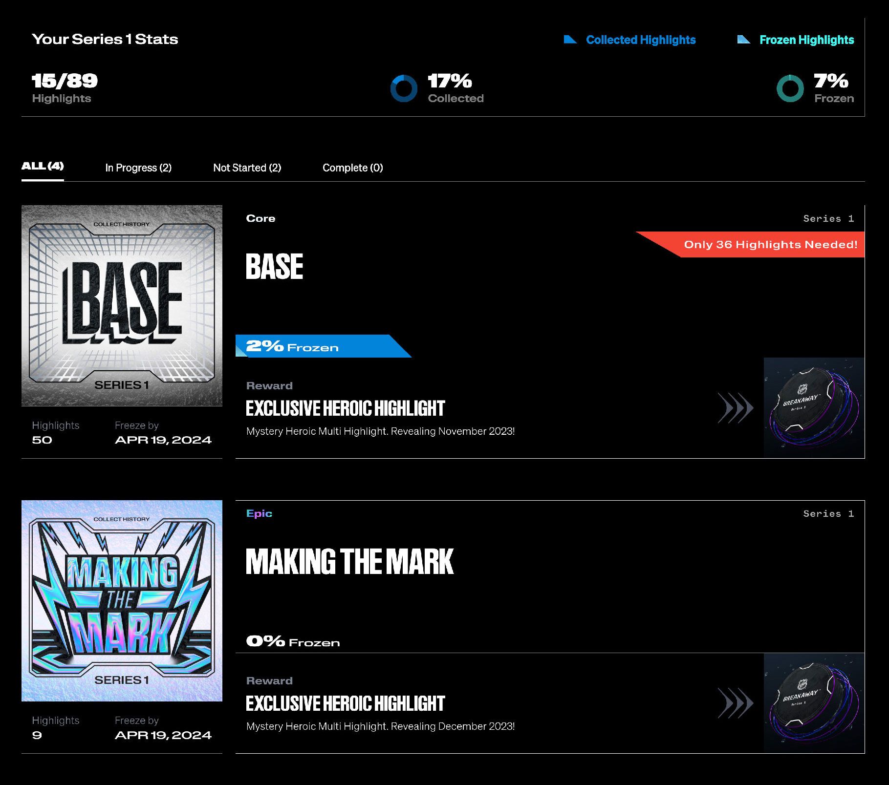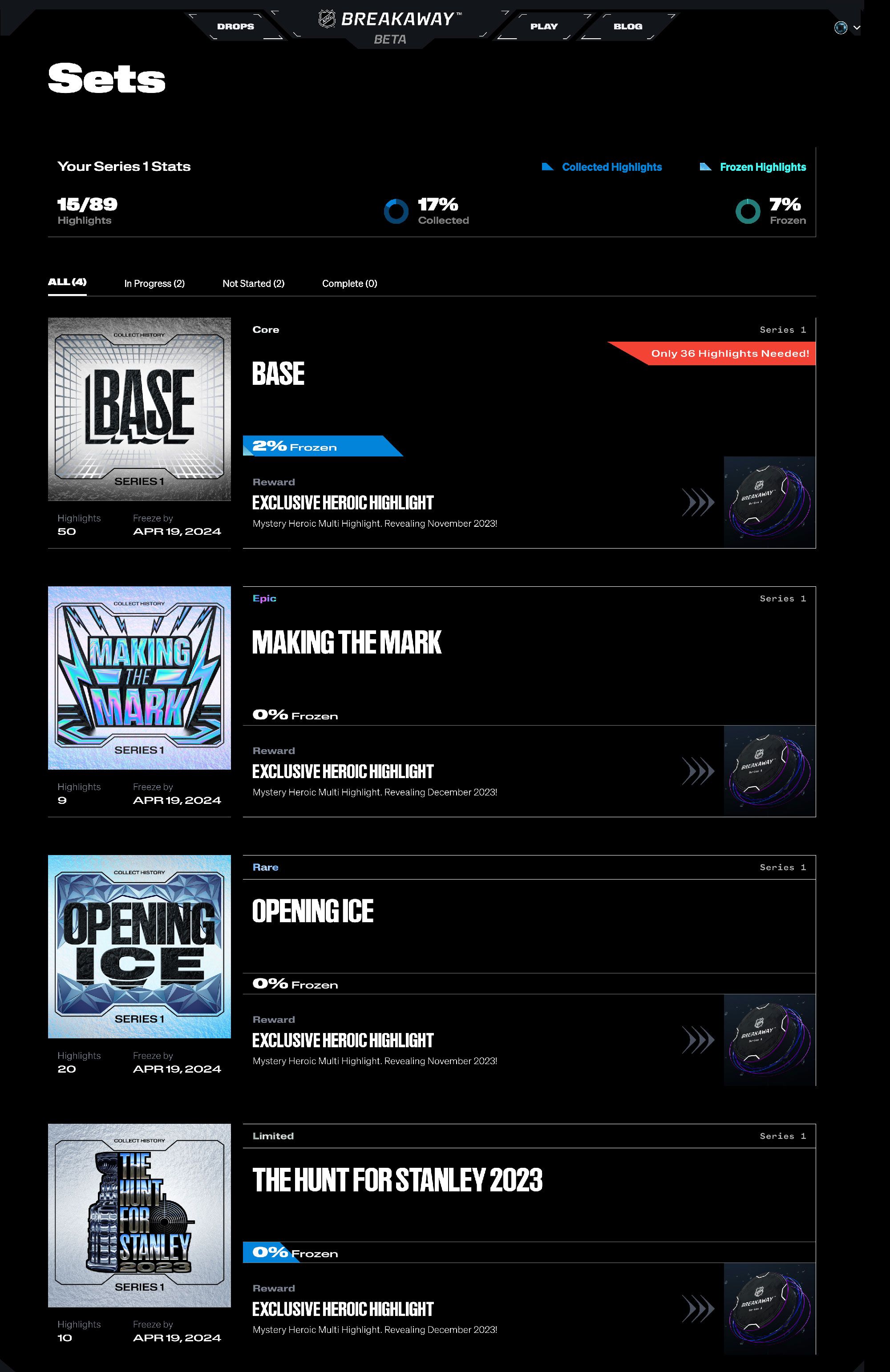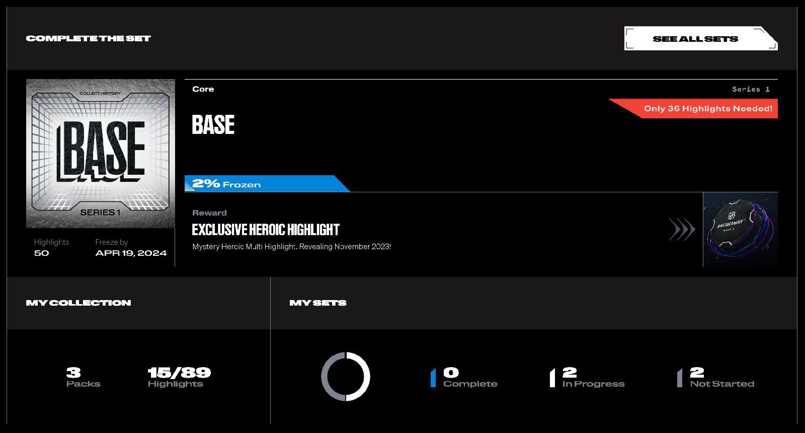 View all highlights within a set, identify what you still need to collect, and freeze your highlights towards earning the set completion reward!