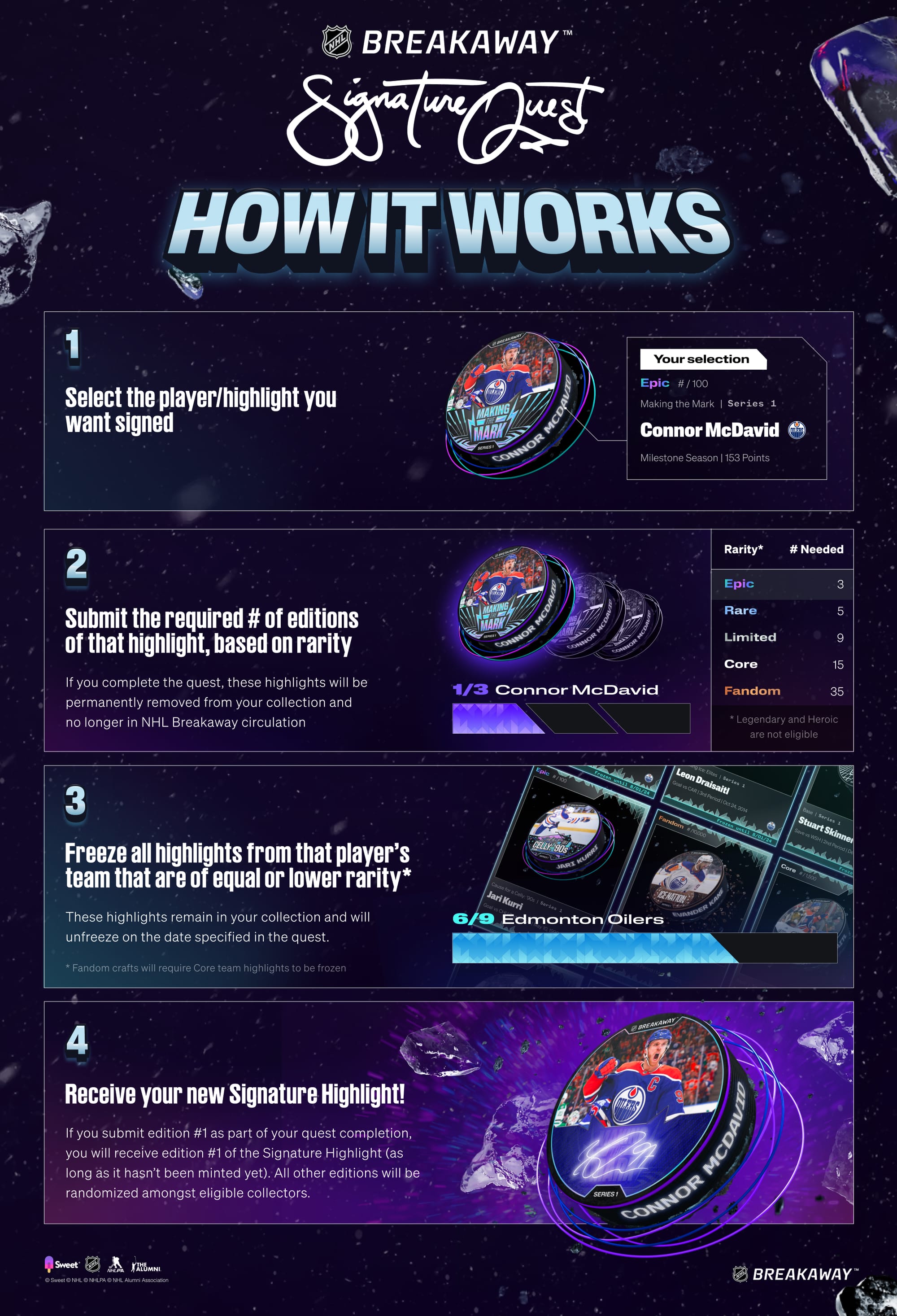 - Adds Utility for Nearly Every NHL Breakaway Collectible - Hundreds of highlights across Epic, Rare, Limited, Core, and Fandom rarity tiers now have utility with Signature Quests, as fans will not only need to collect their favorite player’s highlights, but also those across their favorite player’s team.