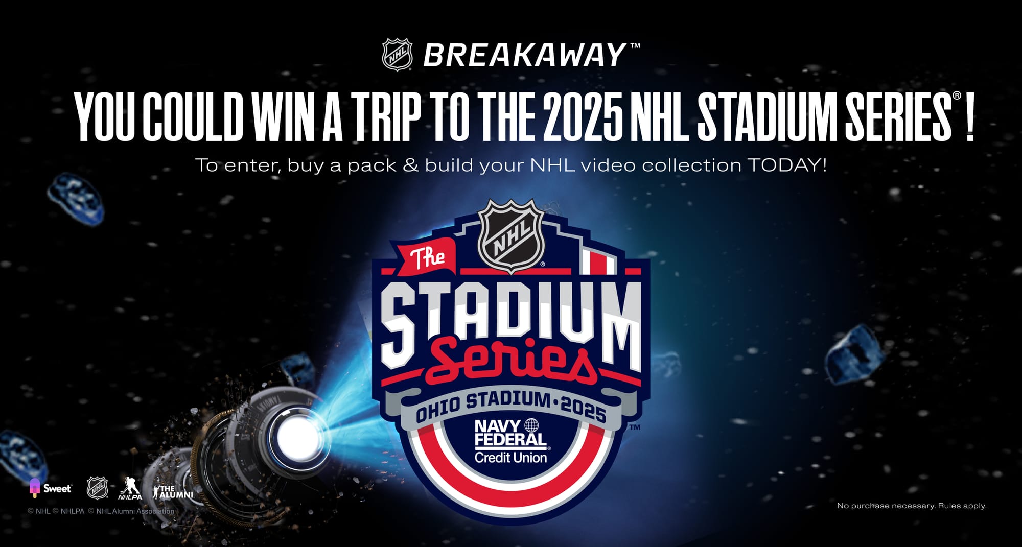 From January 3 until January 18, each pack you purchase from NHL Breakaway’s Drops page is an entry for a chance to win a trip for two to the 2025 NHL Stadium Series®, including airfare and lodging!