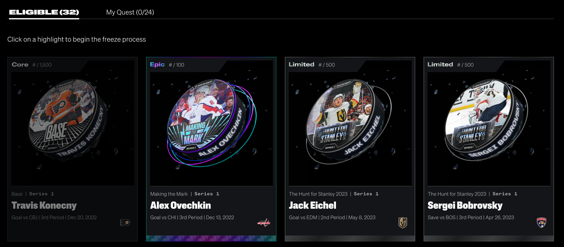Quests are collection challenges similar to Set Completions, and reward users for collecting and freezing highlights that all share a common theme (e.g. “Collect and freeze all the #1 draft picks”).