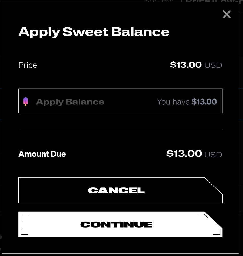 (5) If you have an existing Sweet Balance, whenever you make a purchase from the Drops page or Marketplace, you will be asked if you would like to use your existing balance.